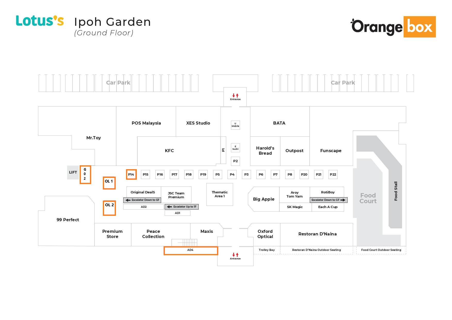 Located on the ground floor beside escalator.